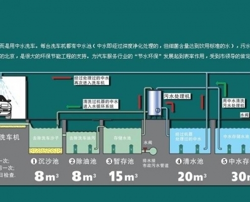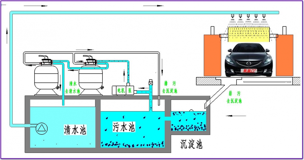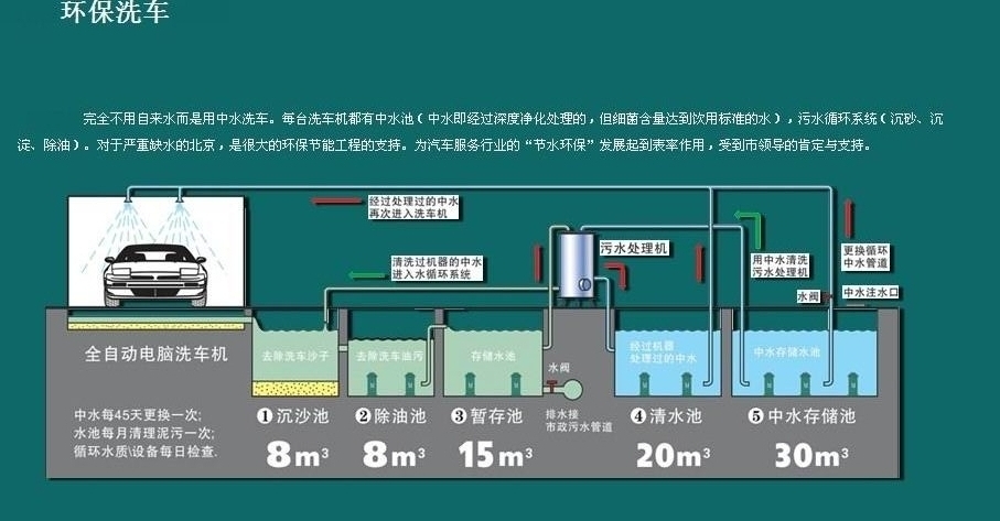 - 洗車循環(huán)水系統(tǒng)UItraCIean 在回收水方面將變得輕松經(jīng)濟(jì),洗車后廢水流入初沉淀池,大顆粒物體在此驚醒絮凝沉淀